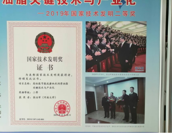 恭贺河南大学中原学者张治军教授于2019年12月在高性能节能抗磨纳米润滑油脂关键技术与产业化项目获得国家发明二等奖。